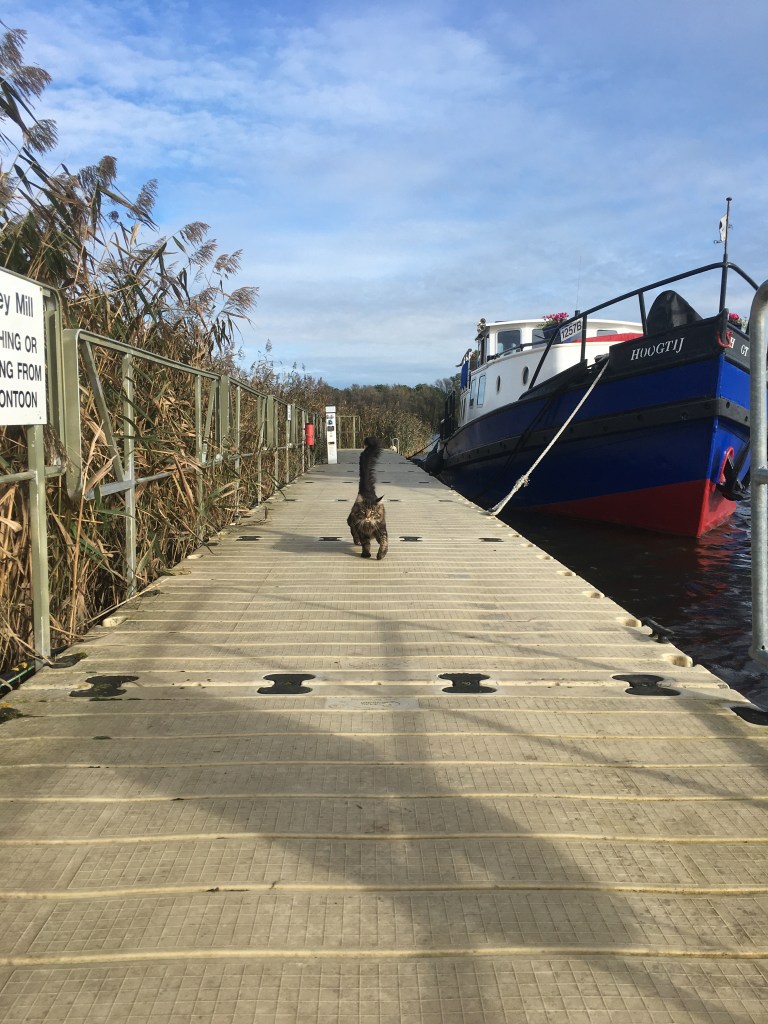 We passed the Reedham ferry, timing our crossing with its stop on one side of the river. I rang the bridge ahead to find it was just opening – good timing! Smoothly and in no time we reached Breydon water, turned sharply into the Waverney and almost there! To our surprise, Zeeshan emerged from under the sofa and sat in the wheelhouse with us. He had not been so relaxed since the journey from Essex when he was traumatised by a violent bow wave. Since then he always hid under the sofa when the engine purred into action. Phil did a perfect approach to our mooring, I casually threw my ropes and eased the old girl into our usual position – measured by a coiled rope we call a mat. Sadly a short adventure, mainly due to our lack of solar power and need for more electric at this time of year. Zeeshan leapt off to go explore his usual haunts and we plugged back into shore power and put the kettle on… Short but sweet and bold as brass!