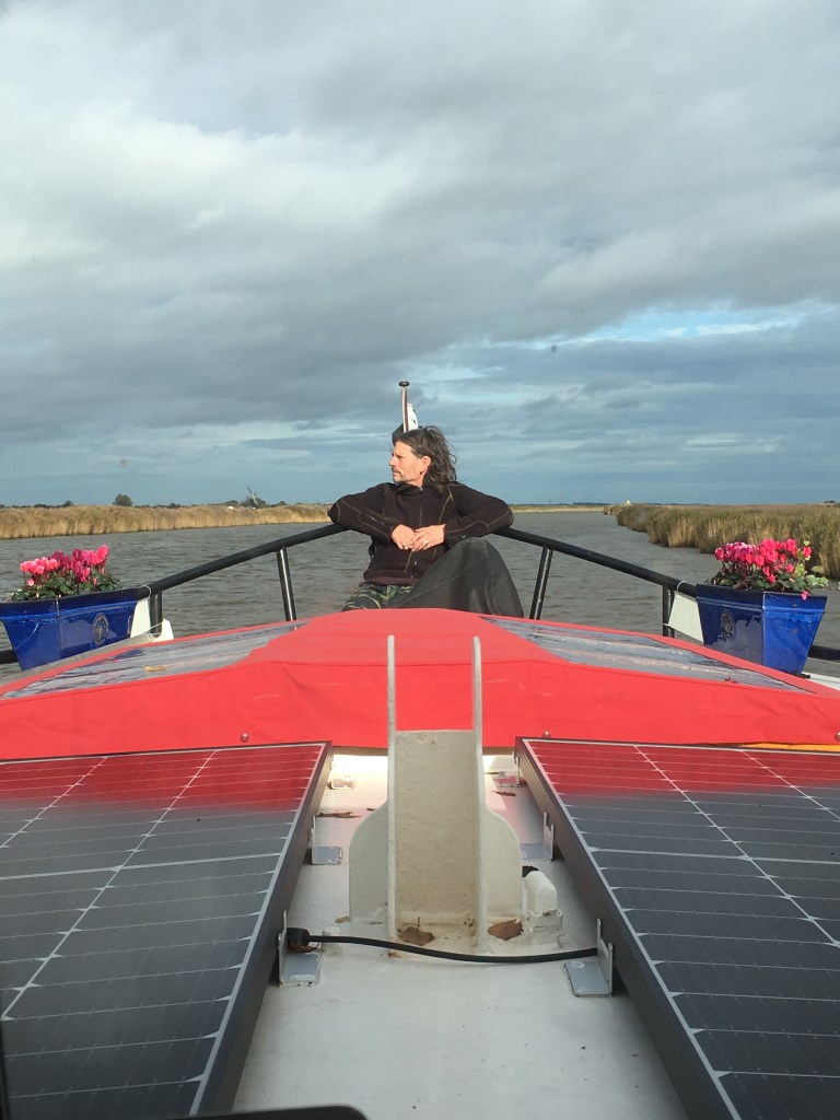 On a bright late October day we decided to set out with Hoogtij once more to hone our new found confidence on our Norfolk rivers. We chose our moment with the tide, to turn on a bow line from our home mooring, just as we had done previously. Only this time, Oh my, what a fail! Hoogtij started a beautiful turn, all going well, until I realised my stupid mistake! As I allowed the rope to slip off the post to be retrieved, I saw that I had left a knot at the end! I watched helplessly as the knot caught against the post and Hoogtij was tethered, turning further round and heading for a slow side on collision with a gorgeous wooden Norfolk yacht! All I could do was shout for help! As fortune would have it, a young man was on the afore-mentioned yacht. He poked his head out, calmly ascertained the situation, leapt onto the pontoon and loosed the rope! Phew! He then proceeded to push us away from his shiny boat as we came within a foot of it, and then we were free and Phil slowly eased Hoogtij’s backside away! I will never do that again!